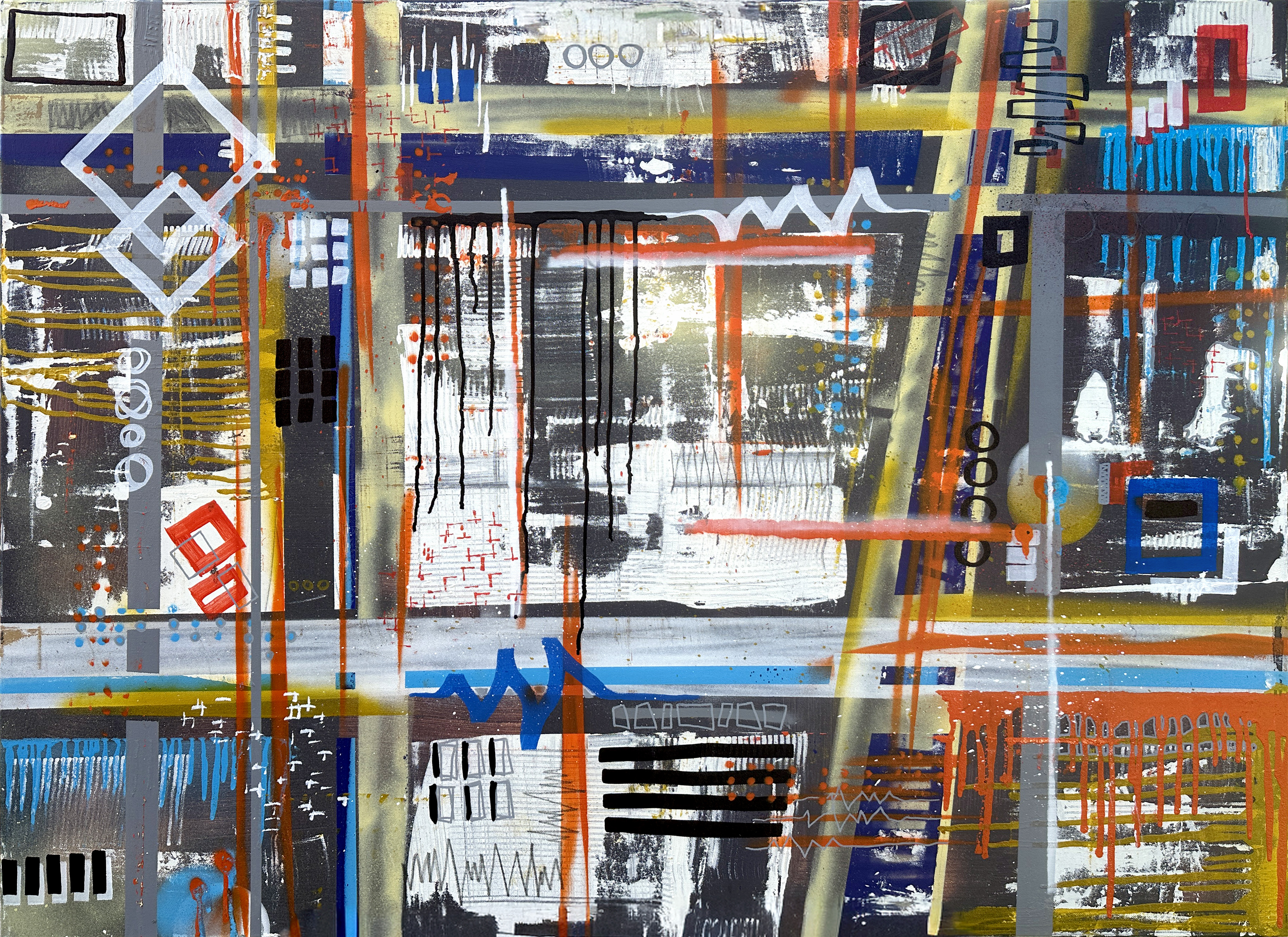 STNS07 est une grande peinture abstraite urbaine où coulures noires, traces de bombe aérosol et bandes horizontales structurent une trame proche d’un plan de ville. La palette mêle noir, blanc et gris à des accents orange, bleu cobalt, jaune ocre et rouge. Losanges, grilles, signes graphiques et fenêtres stylisées s’entrecroisent dans une composition dense, à mi-chemin entre street art et abstraction architecturale, évoquant l’énergie brute d’une façade urbaine.